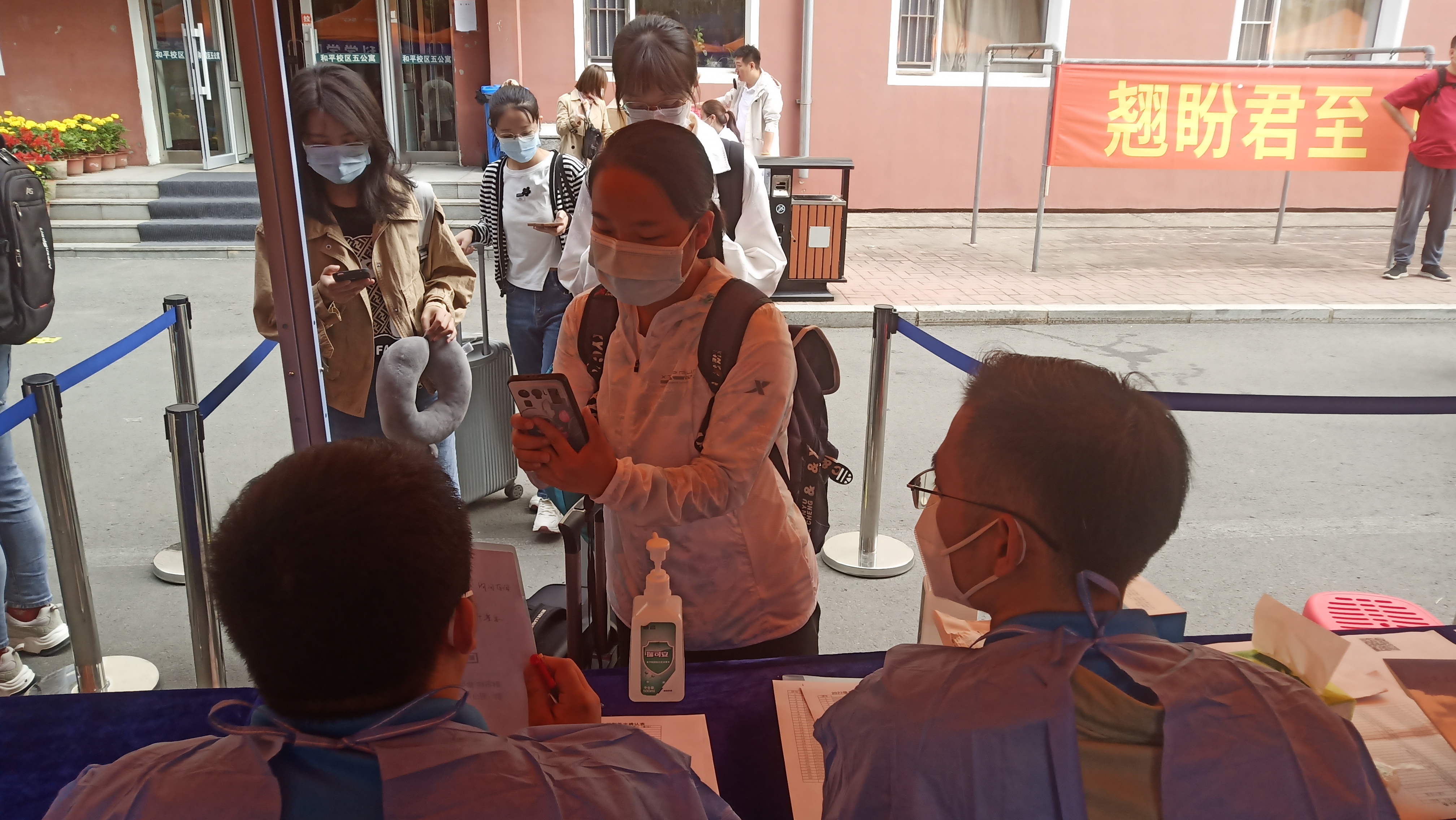 8月24日早七点,迎新工作者们准时到达设立于学生第五公寓前的临时接待站,穿好防护服,戴好N95口罩,开始了忙碌的迎新工作:测温、发放抗疫物资、收集材料,耐心回答新生们的各种问题,为新生们指引宿舍楼的方向。此刻的长春艳阳高照,工作者们防护服内汗流浃背,但耐心依旧,认真负责,帮新生搬运行李、在报到处与宿舍间不断往返以确保迎新生工作的顺利进行。