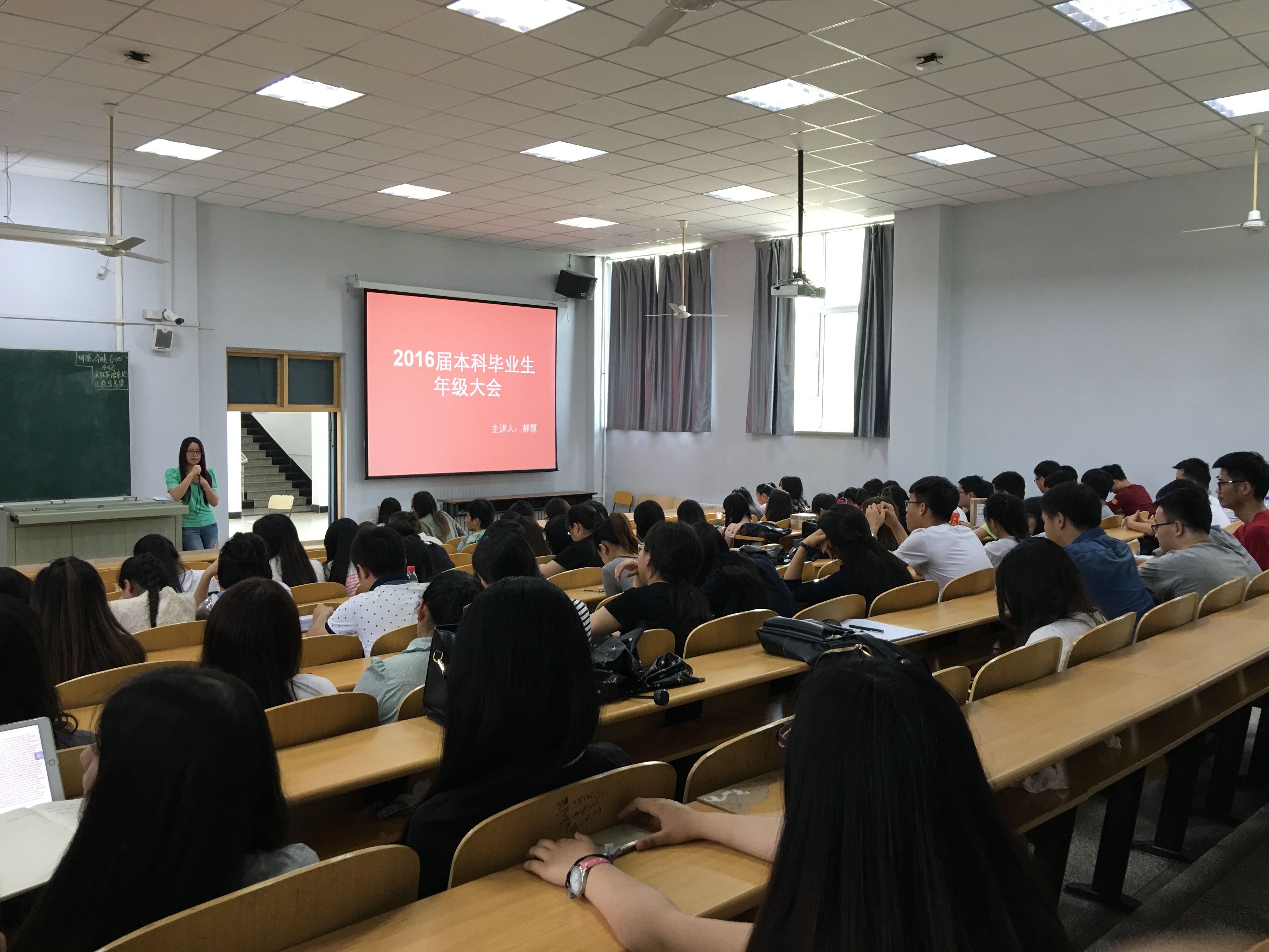 | 2016年6月16日中午12:00,2016届beat365中国唯一官网以及军需科技学院本科毕业生齐聚一堂,于科学讲堂200教室热烈召开毕业生年级大会。本次会议由2012级辅导老师郝慧老师主持。 会议初始,郝慧老师向各位同学传达了关于毕业的相关事宜,包括毕业生档案的整理和档案地址确认、派遣证的核对和发放、户口的迁移落户、毕业证和学位证的发放、党员关系的转移、毕业典礼的召开以及离校手续的办理等等。教导同学们一定要做好毕业前的各项工作,及时关注院系动态和新通知,以免错过重要的通知。另外,郝慧老师还嘱咐每一名学生,几点需要特别注意的事项:第一,毕业在即,同学们在欢聚和告别的同时,一定要谨记安全第一。第二,在六月下旬会有许多重要的毕业相关事项,希望同学们不要离开学校以免给毕业带来麻烦。 紧接着,由2012级各班班长和团支书依次上台发表毕业感言,各位班长以及团支部书记都发表了真挚热烈的发言,对学院领导和老师表达了感激之情,对辅导员郝慧老师表达了最真诚的感谢,对与他们朝夕相处四年的同学们进行了美好的祝愿。 会议的最后,郝慧老师与所有的同学合影留念,殷切的希望同学们能够顺利度过在校的宝贵时光,祝福所有2016届本科毕业生一帆风顺,前程似锦!