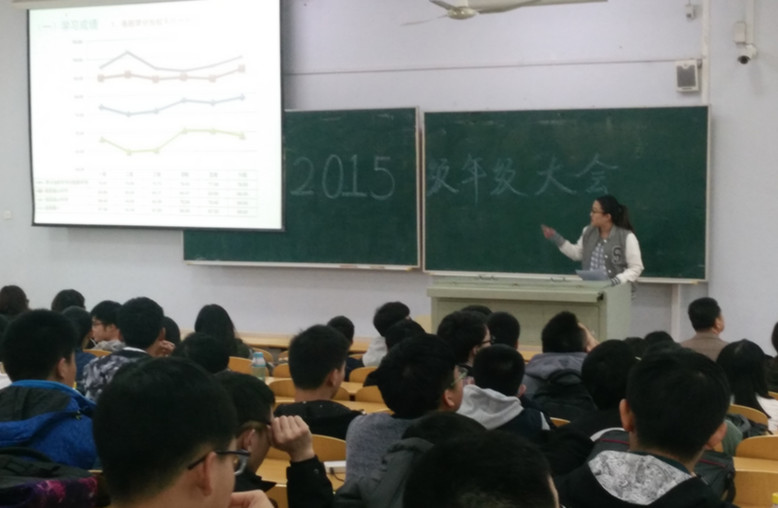 会议开始,辅导员于一丁老师首先从学习成绩、挂科统计、英语四级统计、问题分析等四个方面对2015级学生上一学期学业情况进行了全面的分析,再运用图表详细明了地对2015级各班综合学习情况进行了梳理。接着,于老师详细分析了同学们在态度、时间分配、心理影响、班风寝风等方面的问题。结合学生的学业情况及存在问题,于老师提出了新学期的工作计划:(一)提高学习劲头,保证课堂到课率;(二)提高四级通过率,保证六级通过率;(三)建立班委责任制,端正学习态度;(四)与个别同学家长保持沟通;(五)监督完成周计划、周总结等。