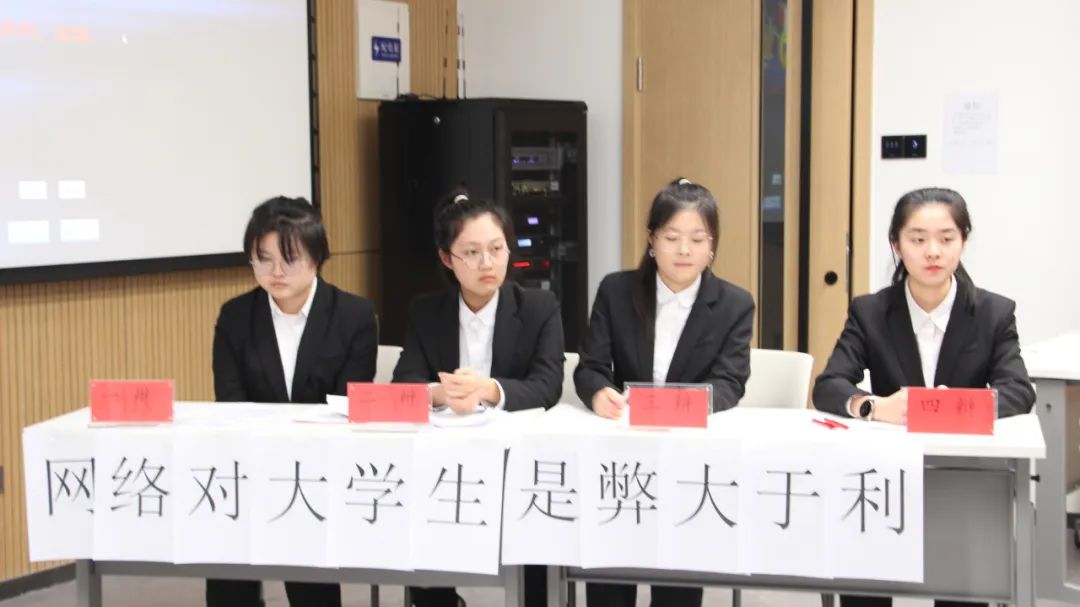 半决赛第一场的辩题是网络对大学生的利弊。正方我说的都队与反方从容应队进行了激烈的交锋。参与第一场比赛的评委有学院团委副书记纪宇婷、学院新媒体中心负责人王治、学院辩论队队长于玥、学院团委学术实践部成员王永祺。