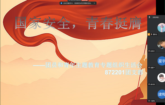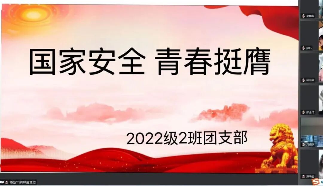 2025年4月16日,2022级4班团支部全体团员于腾讯会议召开线上会议。会议以“国家安全,挺膺担当”为主题,旨在增强同学们的国家安全意识。首先,团支书从多个方面详细介绍国家安全知识;随后,共同观看国家安全教育相关视频;最后,大家结合自己的实际经历和感受,分享了如何挺膺担当、维护国家安全的想法和做法。在讨论中,同学们积极发言、互相启发,形成了浓厚的氛围。