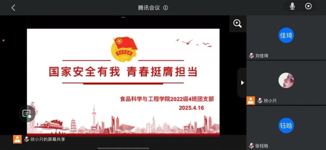 2025年4月16日,2023级4班全体共青团员通过腾讯会议开展了主题团日活动。通过知识讲解、观看宣传片等多种形式,同学们深刻认识到了维护国家安全的重要性,将 “国家安全,青春有责” 的使命感转化为实践动力。同学们纷纷表示,在今后的学习和生活中,会时刻牢记维护国家安全的责任,从自身做起,从小事做起,积极传播国家安全知识,为维护国家安全贡献自己的青春智慧和力量。