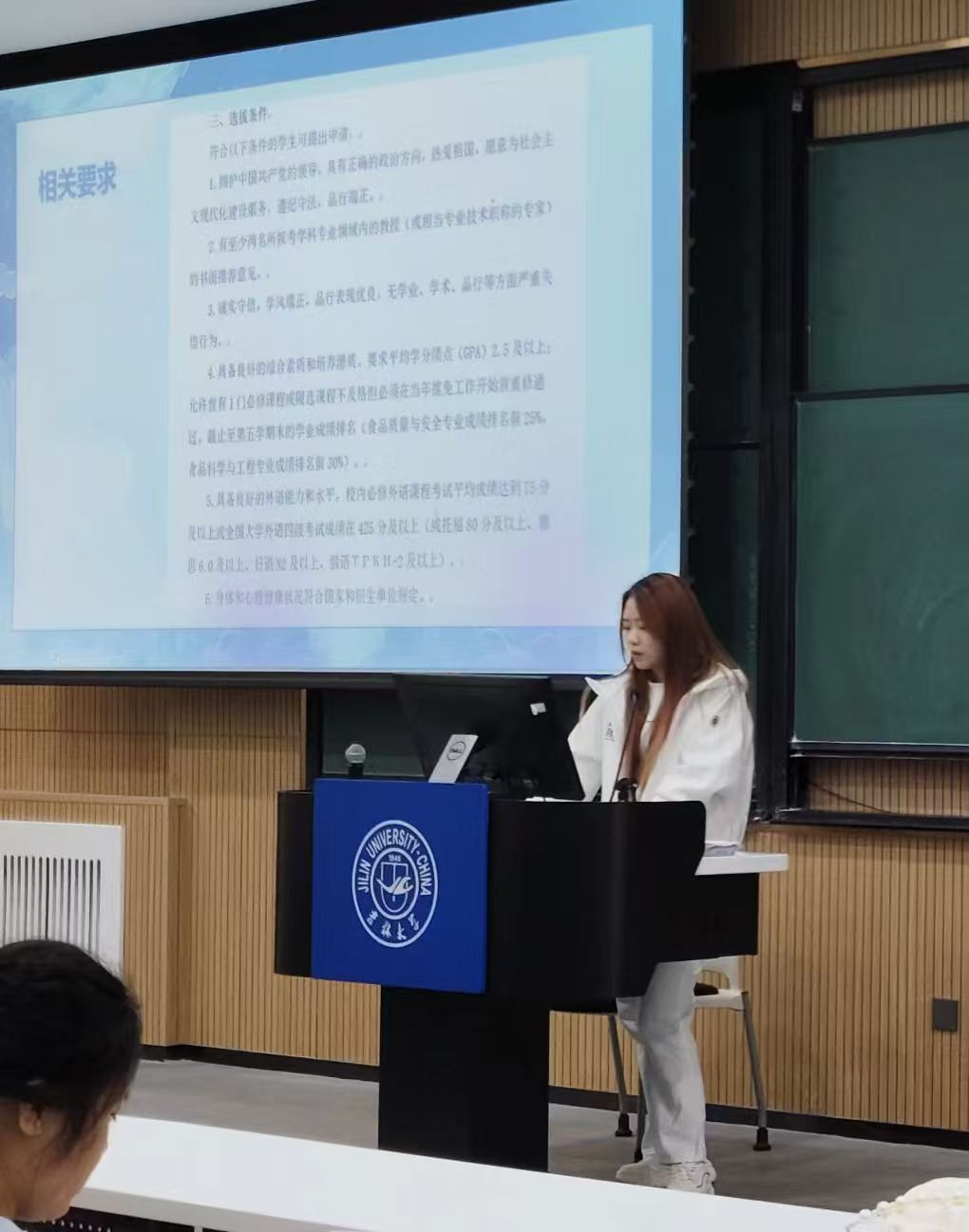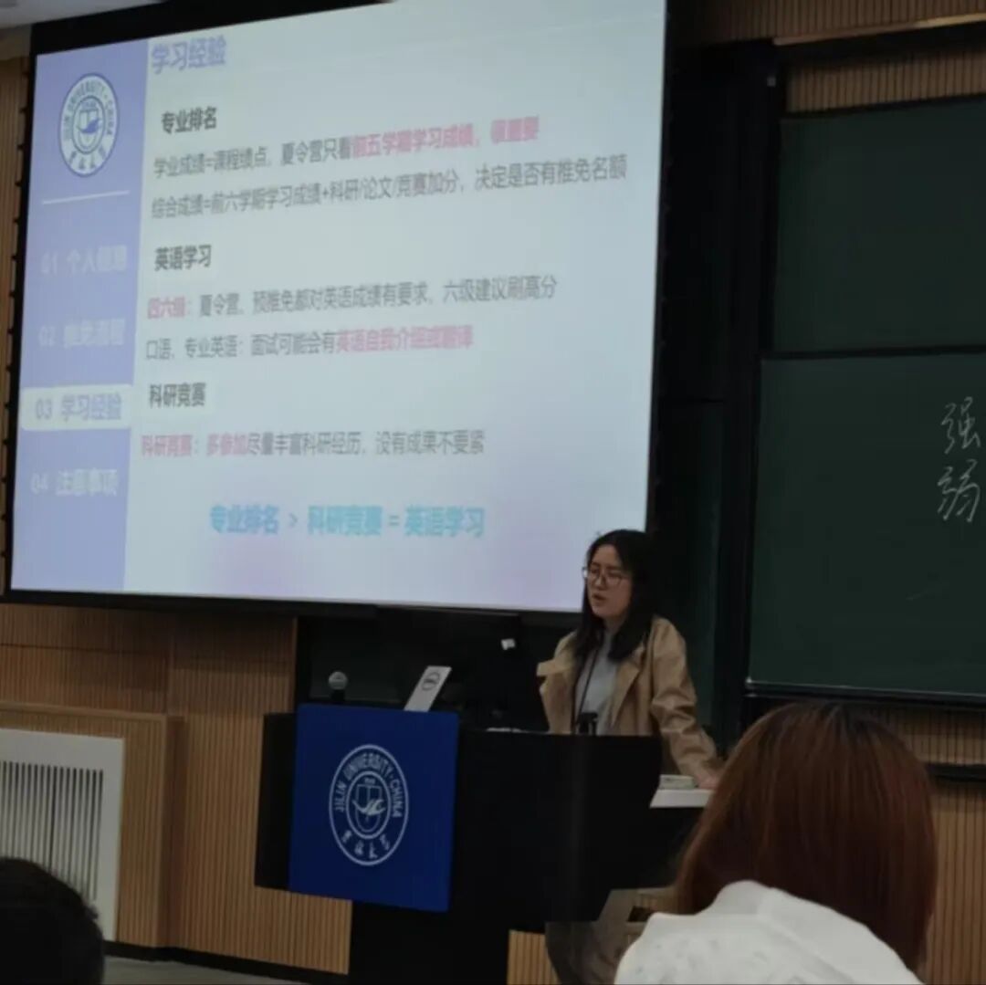 最后一位分享的是郝怡琳学姐,现已直博至吉林大学食品科学与工程专业,她围绕本校保研及直博计划进行了详细解读。郝学姐不仅全面梳理了本校保研流程,还特别提醒同学们要提前联系导师、及时关注官网和群聊通知,以免错过重要信息。就本校直博,郝学姐对推免流程、项目特点、培养方案等进行了全面介绍,使大家收获良多。郝学姐还激励大家找到适合自己的路,坚定的走下去。