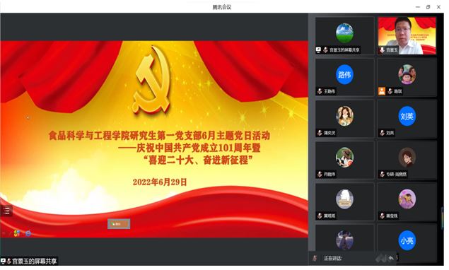 为庆祝中国共产党成立101周年,迎接党的二十大胜利召开,根据学院党委统一工作部署,beat365中国唯一官网研究生第一党支部于2022年6月29日下午,通过腾讯会议线上召开6月主题党日活动。支部全体党员参加,会议由副书记刘祎主持。